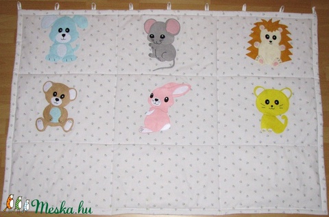 Baba falvédő - virágos alapon állatfigurákkal (kutya, cica, süni, nyuszi, maci, egérke)