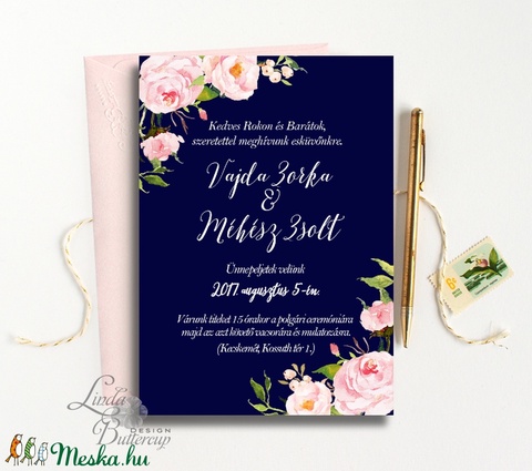 Kék Esküvői meghívó, Tenger kék meghívó, pink, rózsa virágos meghívó, nyári virágos meghívó, vízfesték rózsa