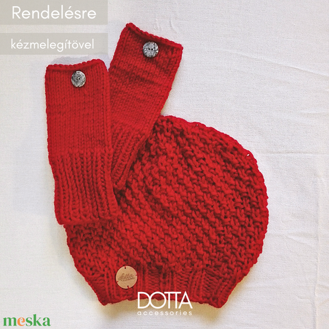 Piros kötött szett - Kincső sapka és kézmelegítő - puha meleg vastag gyapjús fonalból