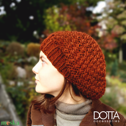 Kincső sapka terra vörös színben - vastag puha meleg gyapjús fonalból - téli slouchy beret sapi