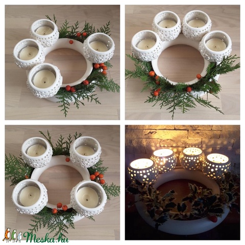 Fehér agyagból kézi korongozással készítettük ezt a rátéttel és kézi áttörésekkel díszített adventi koszorút Ezt a koszorút úgy készítettük,hogy a mécsestartók tetszés szerint tologathatók illetve ki is csúsztathatók a koszorúból.Kialakítása lehetővé teszi hogy vizet illóolajat örökzöldeket helyezzen el benne.Más alkalmakra hangulatos asztaldíszt készíthetünk bele akár aktuálisan kertükben nyíló virágokból.Kellemes ünnepi dekorációja lehet klasszikus és modern lakásoknak egyaránt.A koszorú átmérője;26 cm , a teljes magassága mécsestartókkal:13 cm.Boltunkban minden alkotás kész termék ezért akar azonnal megvásárolható.