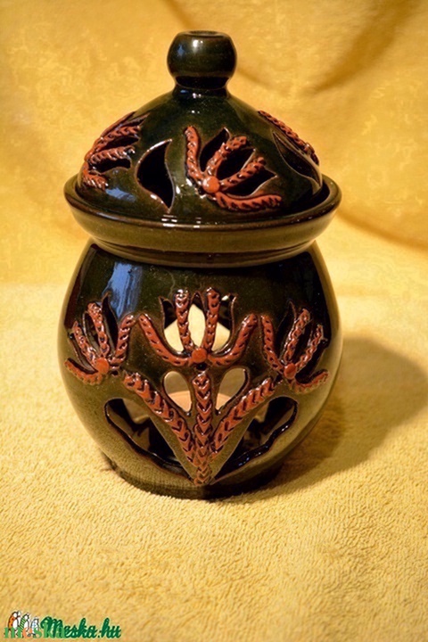 Áttört és rátétes mintát alkalmaztam a korongozott teste és fedőn.( a tálka is korongozott). Sötétzöld színű, a rátét barna színű.