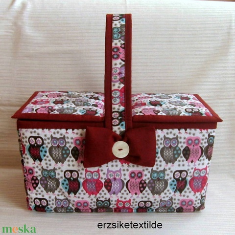 világos vászon, bordó bélés, 2 db fehér gomb, papírkarton , flíz