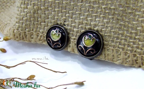Klipsz tűzzománc fülbevaló - virágos fekete-zöld