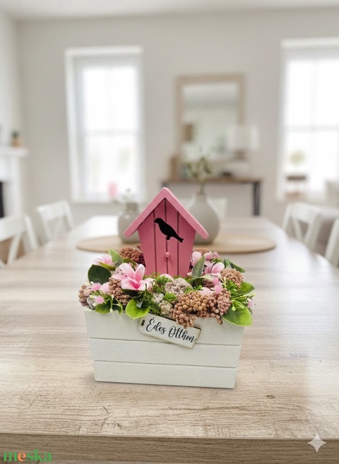asztaldísz fehér fa ládában – rózsaszín madárházzal, mű zöldekkel és virágokkal