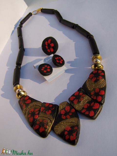 Desigual mintás nyaklánc-gyűrű-fülbevaló szett, fekete-piros-arany