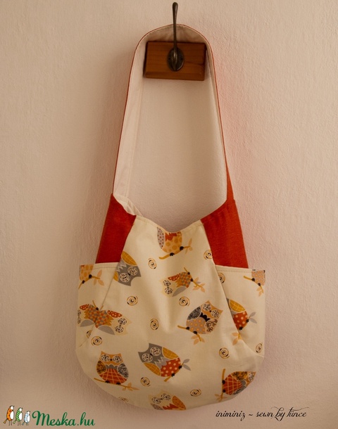 Bézs és barnás/narancsszínű bagolymintás pamutból varrtam ennek a táskának az eleje betétjét és két külső oldalsó zsebeit; a többi részét rozsdaszínű vászonból varrtam: a teljes hátulját, vállpántját és az oldalait.