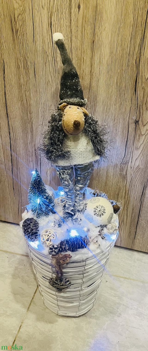 Elegáns, téli hangulatú dekoráció, amely már az ajtó mellett megteremti az ünnep varázsát. A 71 cm magas, szürke–fehér színekben díszített vendégváró dekor finom LED-fénnyel világít, középpontjában egy szarvasfigura áll, amely a békés, meghitt karácsony hangulatát idézi.