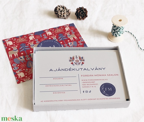 Az első benyomás számít, lepd meg vásárlóidat ezzel a trendi skandináv stílusú karácsonyi, ünnepi ajándékutalvány kártyával. A kártya 2 oldalt színesen nyomtatott, melyre a logód, vállalkozásod adatai, szolgáltatás értéke kerülnek. Az utalvány egyedi, személyre szabott, így módosíthatod a rajta lévő információkat.