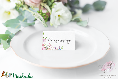 Virágmintás esküvői ültetőkártya, akvarell virágos grafikával, romantikus-vintage stílusban.