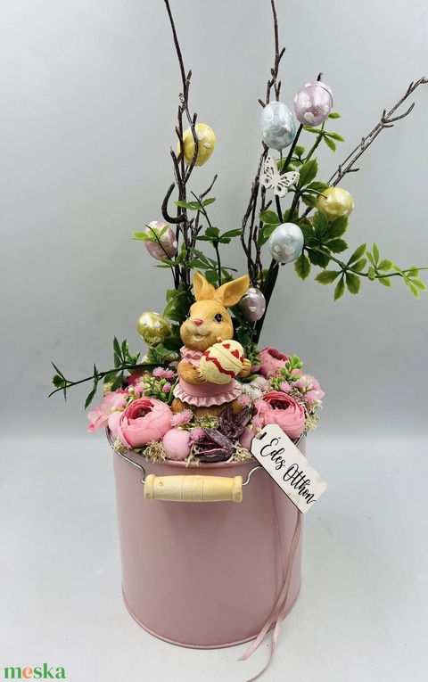 Nyuszis tavaszi asztaldísz rózsaszín bádog kaspóban – kb. 30 cm