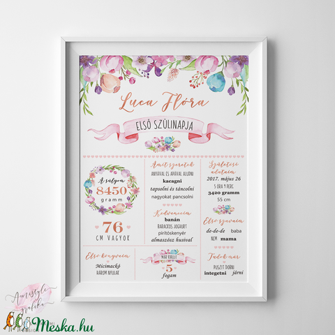 Virágos szülinapi babaposzter, vízfestékes grafikával, első születésnapra, a baba jellemzőivel, adataival.