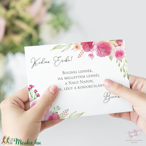 Koszorúslány felkérő kártya, barack és rózsaszín festett mintás virágos grafikával, romantikus-vintage stílusban.