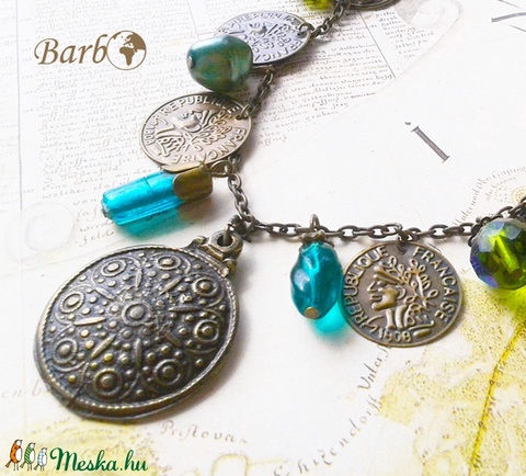 antik bronz szerelék, antikolt lánc, üveggyöngyök