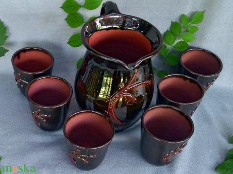 A készlet tartalma egy kancsó(2 liter) és 6 pohár( 1.5 dl-esek) melyeken a minta ugyanaz. A készlet minden része zöld, a minta pedig barna és minden részét magam készítettem.