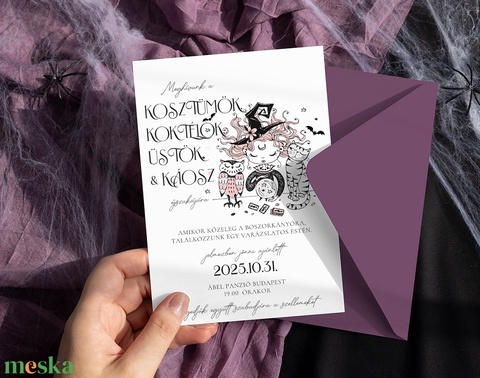Varázslatos grafikával illusztrált halloween party meghívó, képeslap, mely egy oldalt nyomtatott, prémium minőségű, matt vagy akvarell papírból készül.