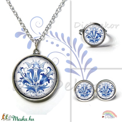 Nyaklánc kék népi motívumokkal, kék hímzés, medál, népies ékszerszett, ajándék nőknek