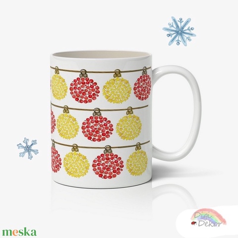 Karácsonyi bögre piros és sárga gömbökkel, aranyalmákkal. Hangulatos ünnepi bögre.