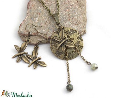 Tavaszi erdőben - Antik bronz szett szitakötővel, mohazöld színű gyöngyökkel