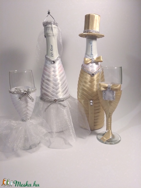 Pezsgős üveg és pohár szett drapp, fehér