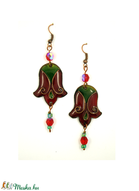 Bordó, zöld tulipán alakú tűzzománc fülbevaló
