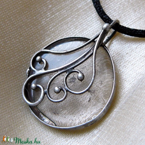 A medál tiffany technikával készült füstkvarc és ólommentes, ezüsttartalmú ón felhasználásával. A díszítés szintén saját készítésű, nem tartalmaz gyári elemeket.A fémrészt óezüstre patináztam és lelakkoztam, hogy sokáig szép maradjon.