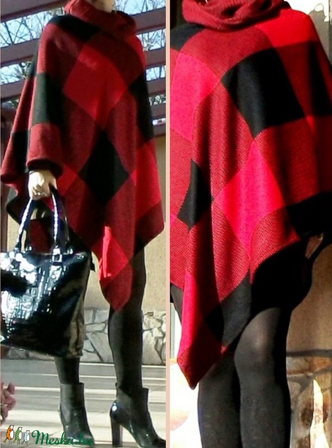 Piros-fekete kockás, hosszú poncsó