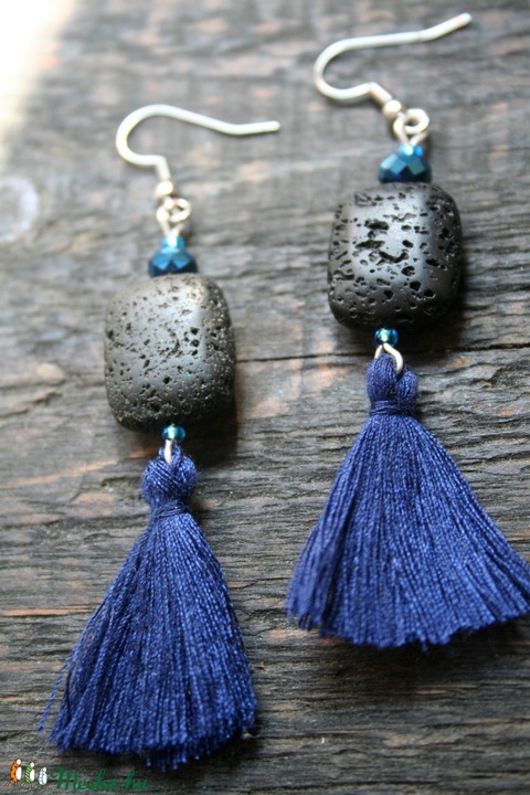 Kék-fekete bojtos lógós fülbevaló, női fülbevaló, ajándék