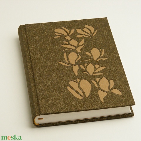 Határidőnapló 2019-re, napló, 2019-es naptár enyhén csillogó óarany, áttört borítóval. A borító fémhatású, tompán csillogó óarany anyagából az áttört virágmintát lézerrel vágtam ki, alatta világosbarna vászon. Személyessé tehető, az áttört minta mellett kérhető egy-két betű, monogram is. A borítóhoz választhatsz még királykék, fenyőzöld, bordó és padlizsánlila anyagot, vagy ezüst és arany színűt, mind enyhén csillogó, "fémszálas" hatású (színben hozzáillő vászonnal). A belső oldalak kézzel fűzöttek, régies kézírást utánzó betűtípussal. Egy oldalon két nap, egy hét összesen négy oldalon, a vasárnap alatt minden héthez fél oldalnyi jegyzetelő. A lapok mérete: 14 x 20 cm, 224 oldal. Egyéb határidőnaplóimat itt találod: https://www.meska.hu/Shop/index/2271/4540