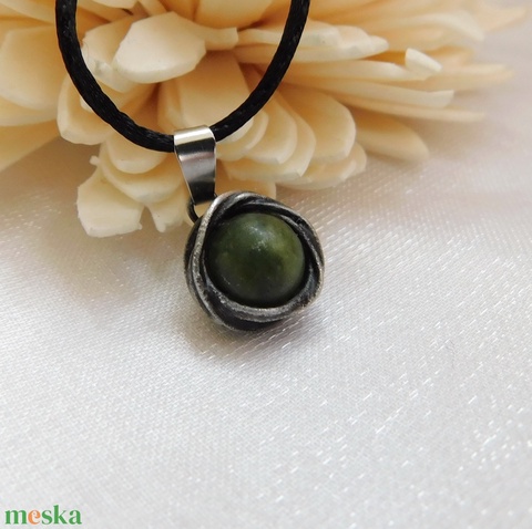 A medál Tiffany technikával készült jáde, réz és ólommentes, ezüsttartalmú ón felhasználásával. A díszítés szintén saját készítésű, nem tartalmaz gyári elemeket. A fémrészt óezüstre patináztam és lelakkoztam, hogy sokáig szép maradjon.