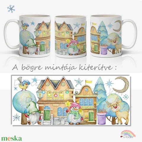 Téli utcakép. Hangulatos karácsonyi bögre manóval, hóemberrel, rénszarvassal, madárkával, házakkal.