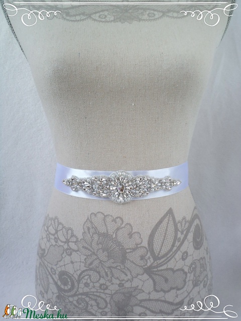 Ovális közepű, foglalatos köves és tekla gyöngyös menyasszonyi öv választható színű szalagon