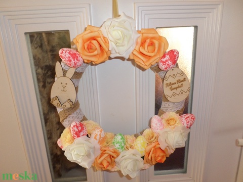 - Anyaga: selyemvirág, szalmakoszorú, szalag, tojásdiszek