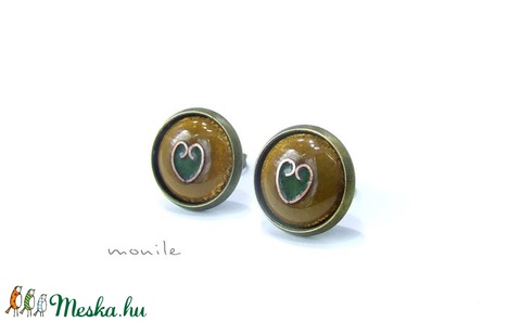 Bedugós tűzzománc fülbevaló - szíves mustársárga-zöld