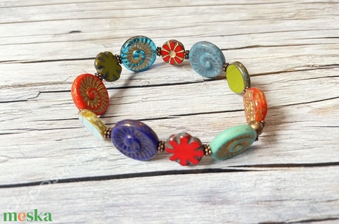 - Anyaga: gumis damil, üveggyöngy, kerámia gyöngy, bronz szerelék