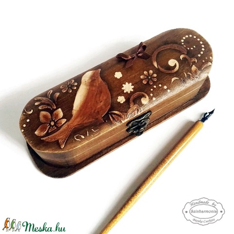 A fa tolltartót pasztával, fapáccal és más egyéb eszközökkel tettem egyedivé és romantikus hangulatúvá. A tolltartó fából készült, ezáltal időtálló és a lakkozása sem sárgul be rajta. A minta kidomborodik a készítési technikának köszönhetően.