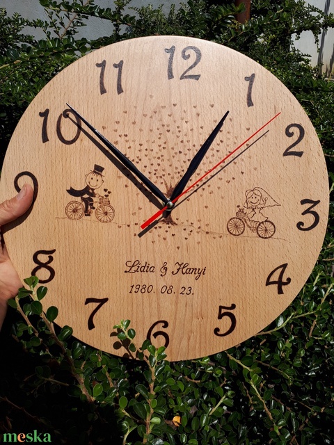 Esküvőre, nászajándékként kézzel készített egyedi fa falióra - biciklis grafikával