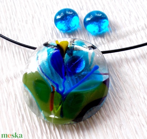 Kék virágos üvegékszer, ajándék nőkneknévnapra, születésnapra.