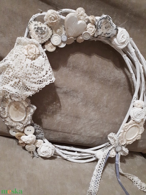 - Anyag/Összetevő vessző, gomb, fa, csipke, vászon, ragasztó, házi porcelán diszek