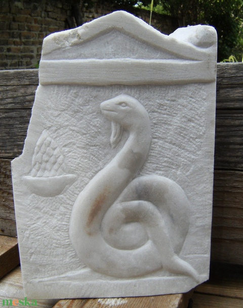 Ez a faragás Zeus Meilichios, görög mitológiai, alvilági lényt ábrázolja. A faragványt egy ókori, görög dombormű inspirálta. Nem pontos másolat, az eredeti az ihletet adta. „Műveim” szándékoltan rusztikusak, nyersek, látni hagyom a véső, fogasvéső és szobrász-reszelő nyomokat.