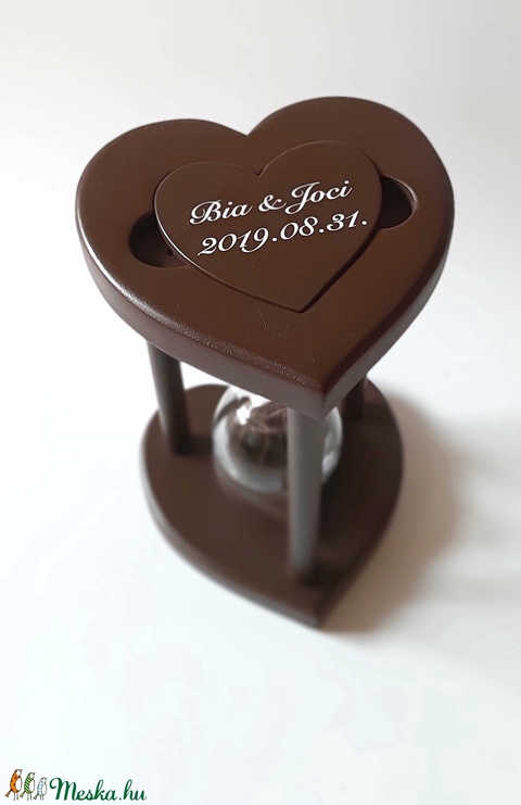 Egy különleges esküvői kellék, maradandó emlék, ajándék az igaz szerelmeseknek, ez a homokkal tölthető sötétbarnára festett, fából készült homokóra.