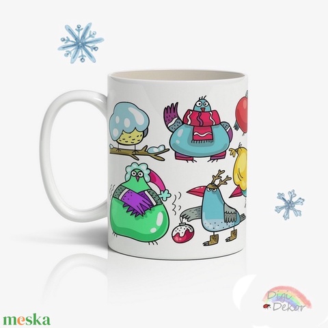 Vidám madaras rajzokkal borított karácsonyi bögre. Tarka, vicces madárkák, téli hangulat. 3 dl-es bögre karácsonyra.