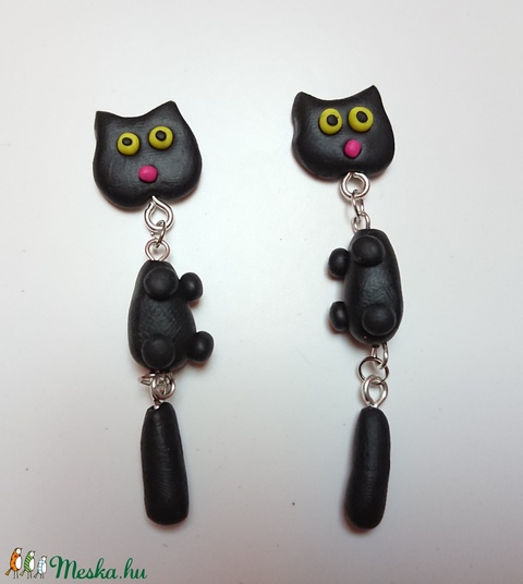 Fekete macska cica hosszú bedugós fülbevaló Fimo gyurma