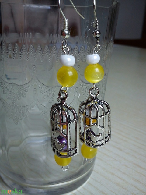 Fülbevaló: madárkalitka sárga lila, rózsaszín és fehér gyöngyökkel