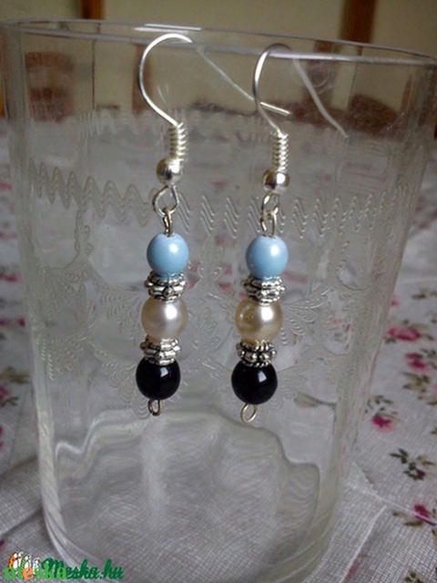 Fülbevaló kék, fehér, fekete gyöngyből, tibet iezüst köztesekből