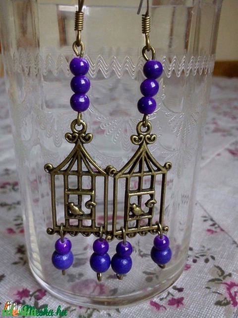 Fülbevaló: bronz madárkalitka lila gyöngyökkel
