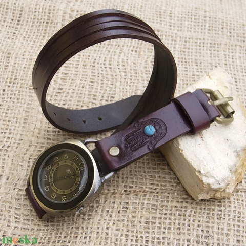 - Anyaga: bronz óralap, marhabőr, türkiz színű szegecsek, csat