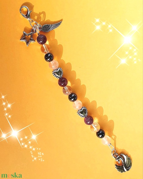 - Anyaga: ametiszt, hegyi kristály, rózsakvarc, hematit, szív alakú köztes medál, ezüst angyalszárny medál, csillag medál, delfinkapocs, hattyúmedál