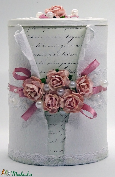 fémdoboz, konzerv doboz, merített papír, kreatív karton, papírvirág, gyöngyfüzér, csipke, szatén, akril
