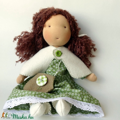 Teste 100% interlock pamut anyag, mely az Ökotextstandard 100 előírásainak megfelel. Kiváló minőségű, magyar kártolt gyapjúval van töltve. Szeme és szája pamut hímzőfonallal hímzett. Göndör frizurája buklé mohair fonalból készült horgolva és szálanként rögzítve. Kézzel igazítható a haja, számos frizurát készíthetünk neki. Arca méhviasz krétával pirosított.